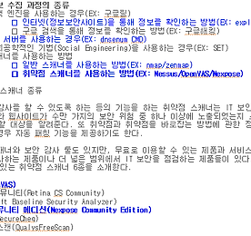 본 내용은 교육 과정에서 필요한 실습 목적으로 구성된 것이며, 혹시라도 개인적인 용도 및 악의적인 목적으로 사용할 경우, 법적 책임은 본인에게 있다는 것을 알립니다. shodan : webcam, cam, 라우터/스위치 패스워드 , FTP, 웹-서버(Apache, IIS) 정보 수집이 가능한 검색 엔진 사이트 주소 : www.shodan.io 회원 가입 (무료/유료 서비스) 쇼단 사이트 활용 용도 admin/admin, admin/1234과 같은 기본 아이디/패스워드 사용하는 환경 검색 (ex: 관리자가 없는 곳의 cctv등) FTP, SSH, Telnet 접속시 유출된 IP 정보 및 사용자 정보 검색 nmap 없이 서비스 목록 및 IP 주소 정보 검색 웹캠, 캠, VoIP 정보 검색 기타 등등 쇼단 사..